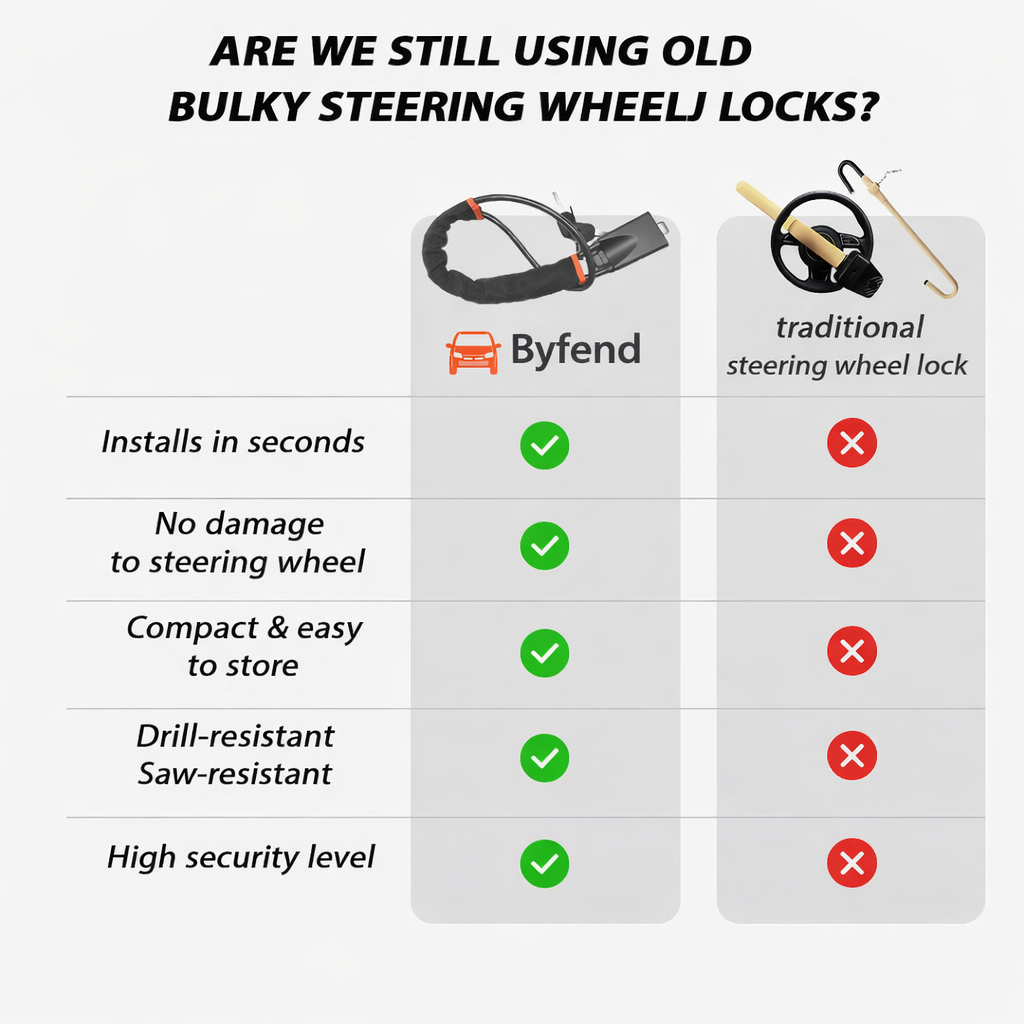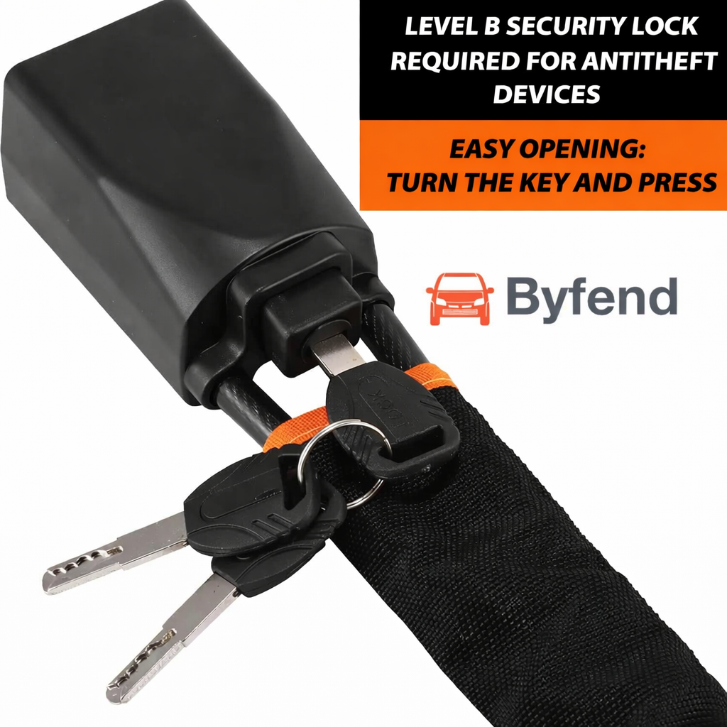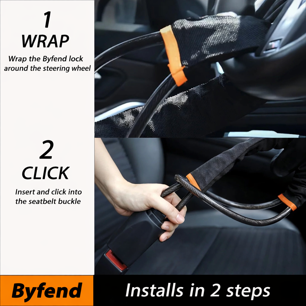 Byfend est l’avenir des antivols de voiture : pas de barre encombrante, pas d’installation compliquée. Il suffit de l’enrouler autour de votre volant et de le clipser dans la boucle de ceinture de sécurité pour obtenir une protection de niveau premium instantanée.